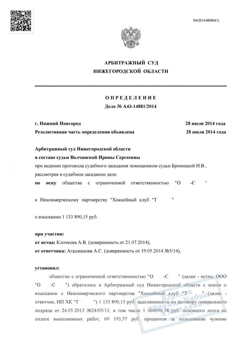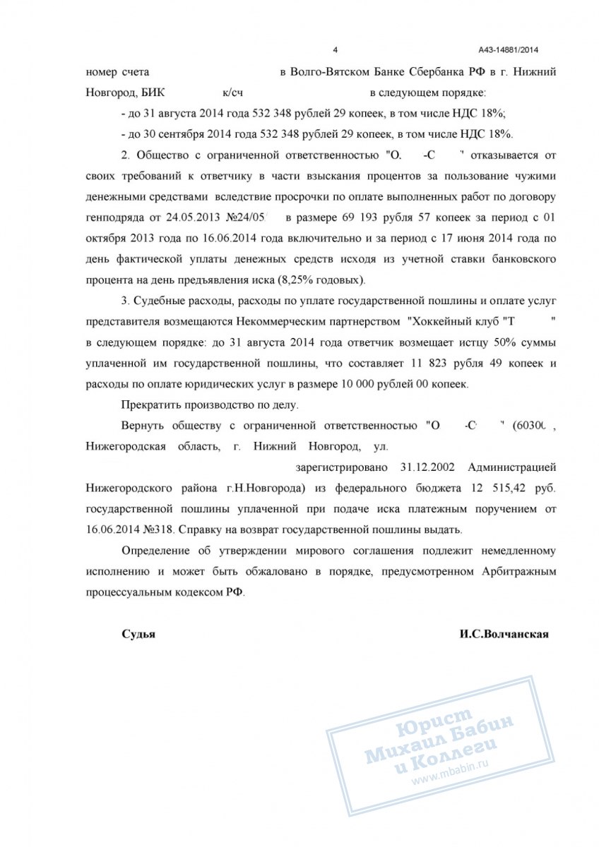 В результате переговорного процесса хоккейный клуб признал задолженность и в полном объёме перечислил ООО «О-С» 1 000 000 рублей. Поданный в суд иск завершился утверждением мирового соглашения, которое зафиксировало все достигнутые договорённости и гарантировало клиенту получение причитающихся средств.