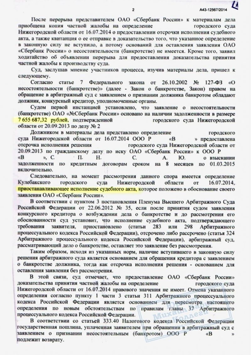 Тем не менее, кредитор не оставил попыток признать «Р.В.» банкротом. Была подана жалоба на решение суда об отсрочке, а также заявление и апелляция в арбитражные суды первой и второй инстанции. Однако все предпринятые кредитором усилия оказались напрасными. Руководитель нашей компании сумел отстоять право ООО «Р.В.» на отсрочку выплаты долга на всех уровнях.