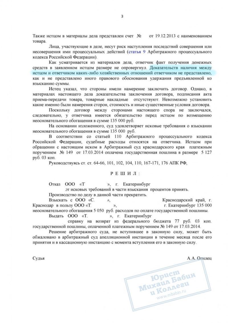 Взыскание 135 000 руб. неосновательного обогащения по предоплате без договора