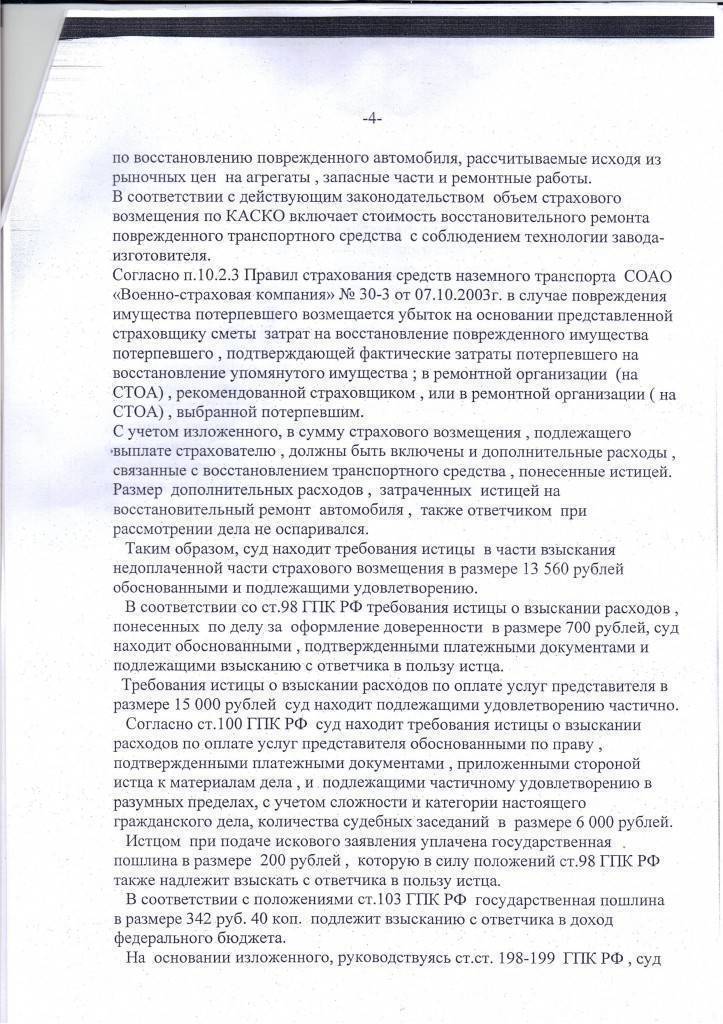 В судебную инстанцию обратилась истица (страхователь) к ответчику (страховщику) о взыскании страхового возмещения понесенных расходов за выполненные ремонтные работы транспортного средства в результате ДТП на общую сумму 13 560 рублей. Кроме того, истица просила удовлетворить расходы на представителя в размере 15 000 руб., по делу – 700 руб. и по уплате госпошлины – 200 руб.