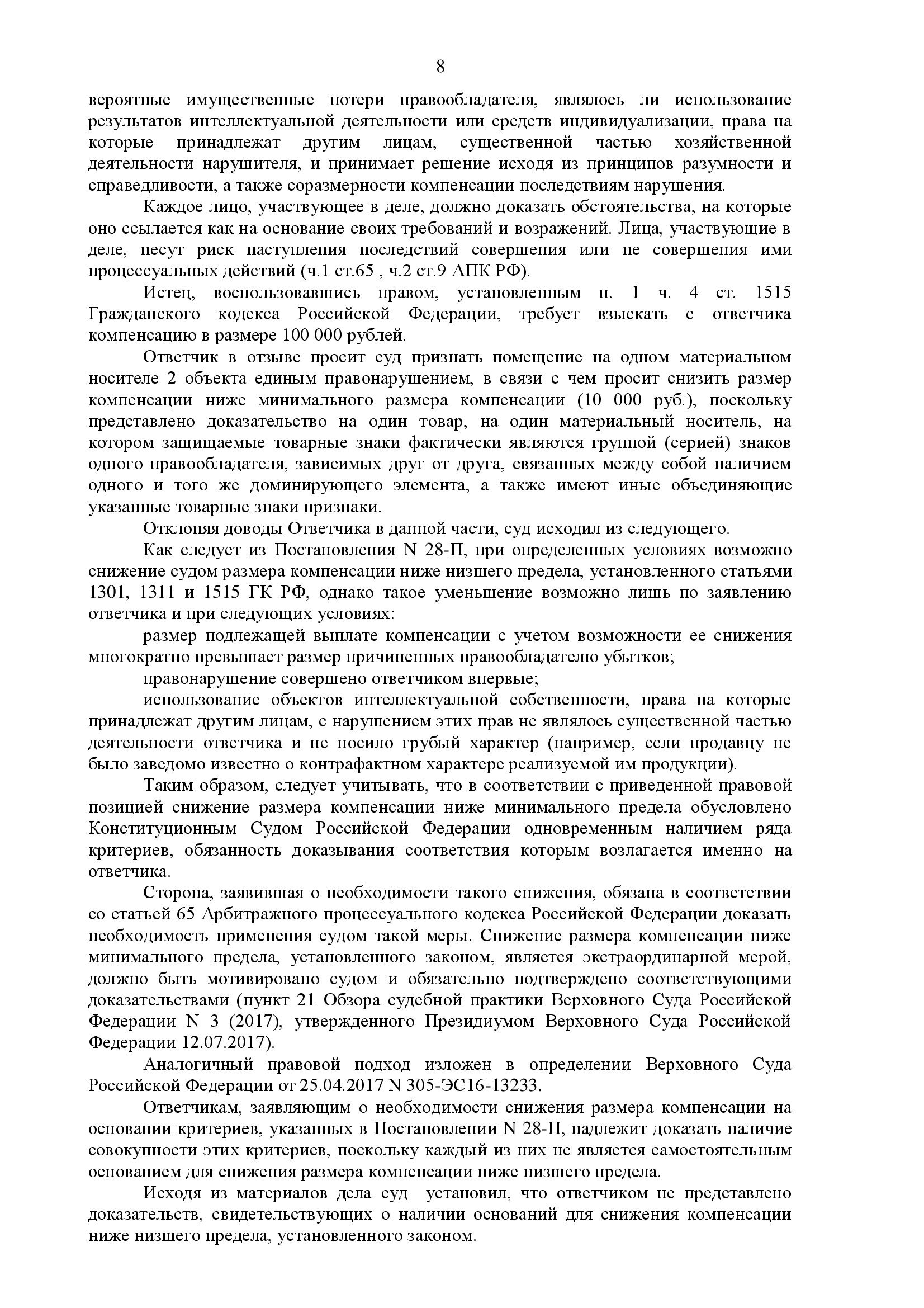 Суд признал факт нарушения, но согласился с доводом о том, что компенсация в размере 100 000 руб. является чрезмерной и не соответствует принципу соразмерности. С учётом характера нарушения, стоимости товара и отсутствия доказательств крупных убытков суд: