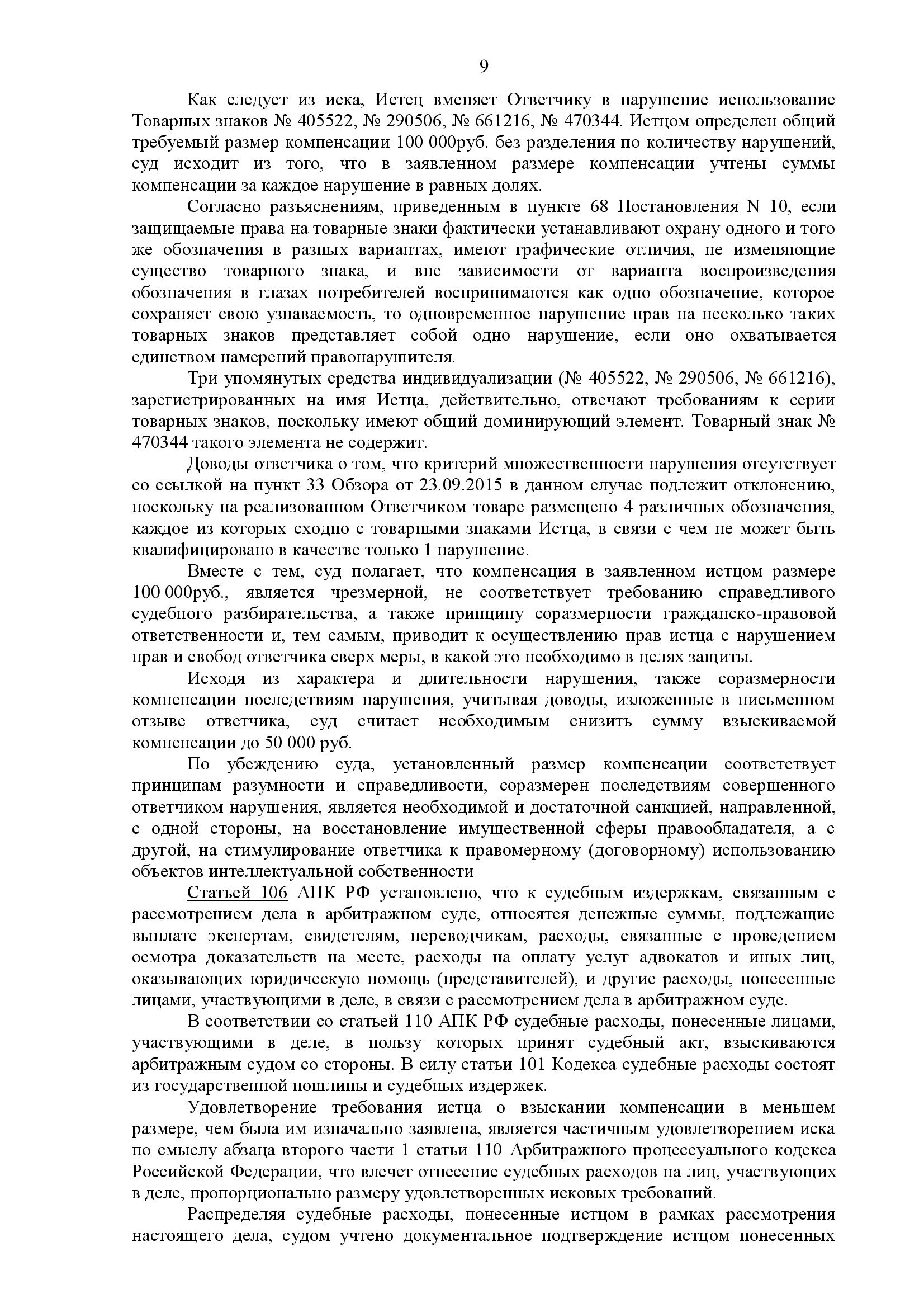 Дело показывает, что даже при нарушении прав на несколько товарных знаков, суд может снизить общую компенсацию, если заявленная сумма явно несоразмерна последствиям нарушения. Особое значение имеет довод о том, что часть товарных знаков образует серию с общим доминирующим элементом, что может учитываться при определении количества нарушений.