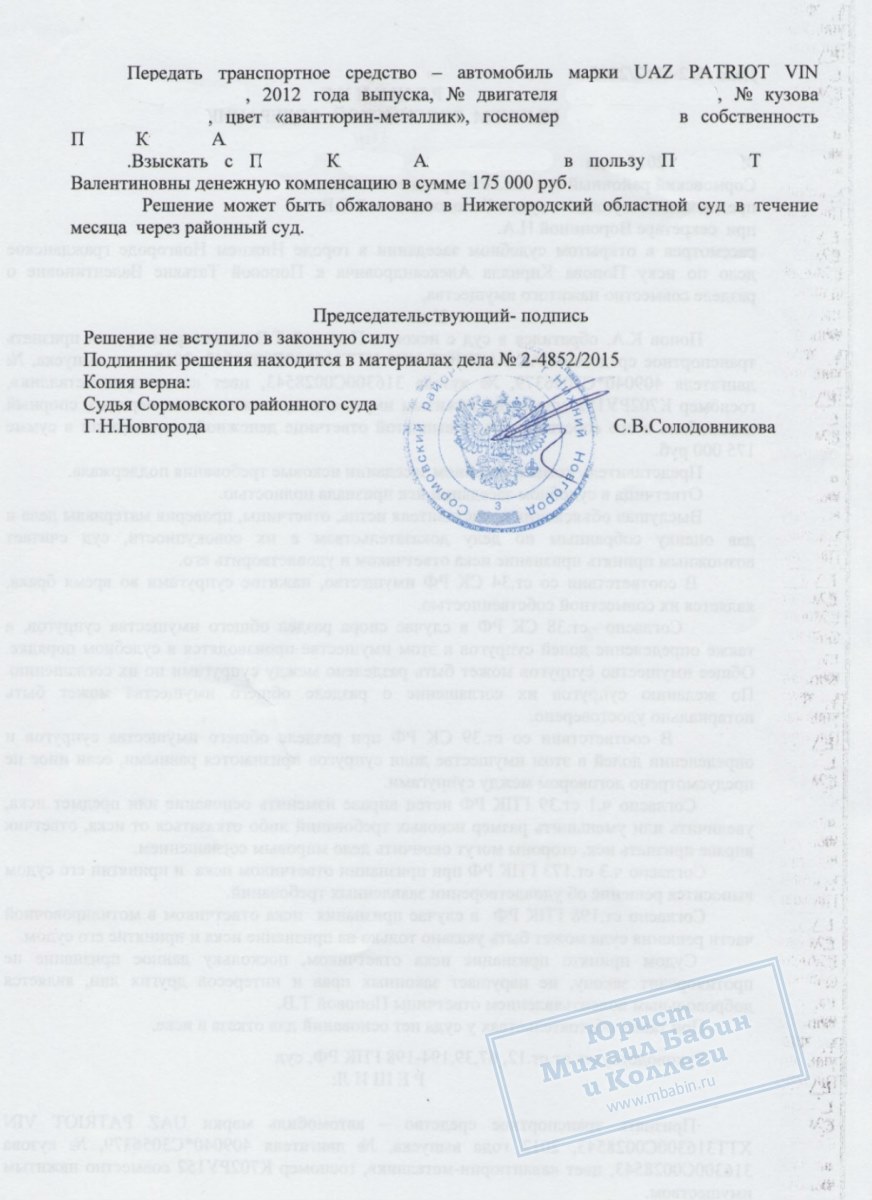 При оформлении процедуры развода и раздела общего имущества автомобиль UAZ PATRIOT остался в доле бывшей супруги. Так как пользовался им, по большей части, супруг, он попытался вернуть себе автомобиль, но женщина отказалась идти на уступки. После привлечения в дело юриста спор удалось решить безболезненным и выгодным для обеих сторон образом: бывший супруг получал свой автомобиль, а его жена - достаточную денежную компенсацию.