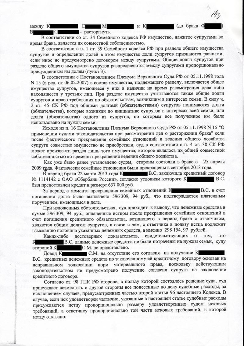 Взыскание половины общего долга с бывшего супруга клиента