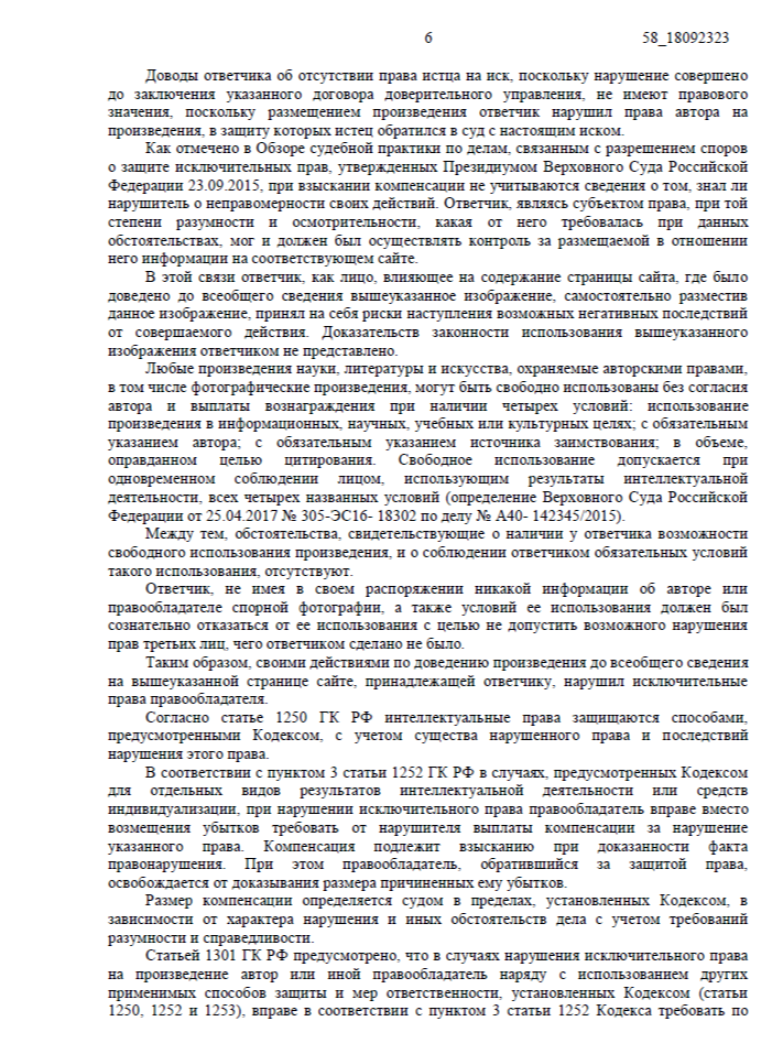 Ответчик использовал чужую фотографию, ссылаясь на то, что нашел её в интернете без указания автора. В суде нарушитель пытался доказать, что это «другой снимок», и оспаривал право нашей компании на подачу иска. Суд полностью поддержал нашу позицию, подтвердив эффективность защиты прав через договор доверительного управления.