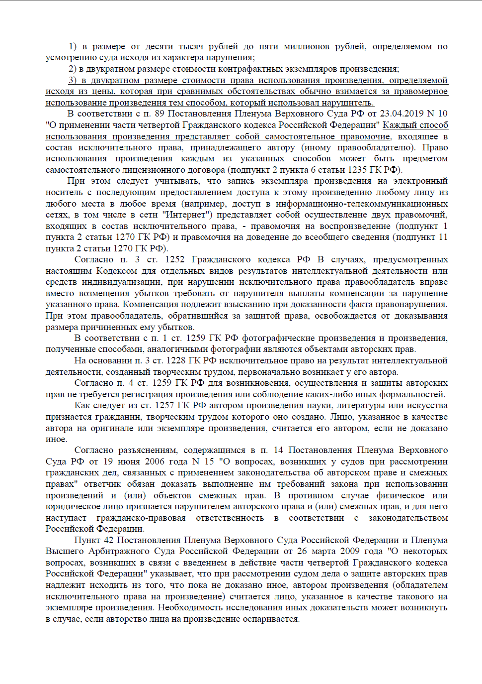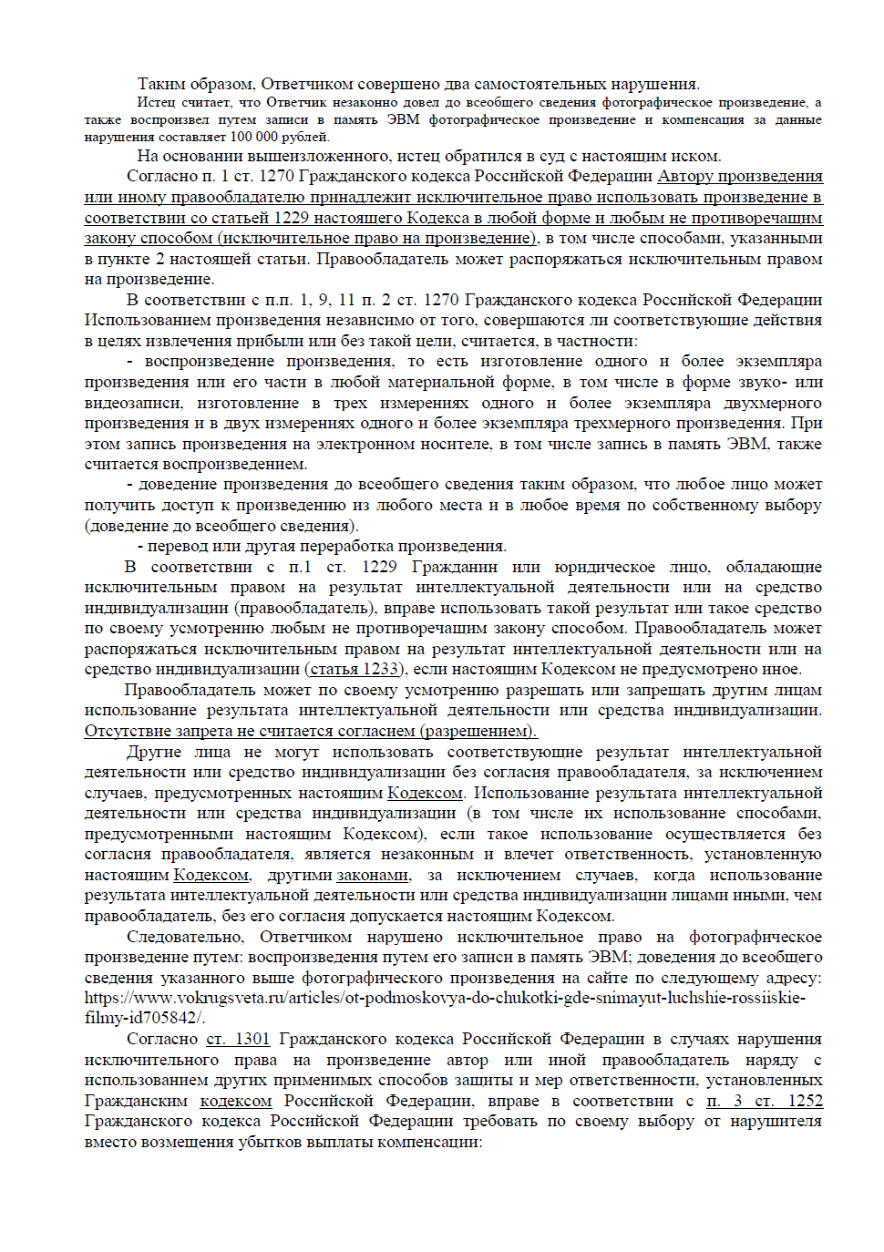 Сослались на ст. 1229, 1252, 1270 и 1301 ГК РФ: были допущены два нарушения — воспроизведение фото и доведение его до всеобщего сведения. Ключевые аргументы, которые легли в основу победы:
