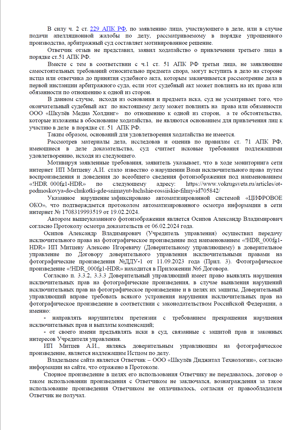 В ходе планового мониторинга интернета автоматизированная система «ЦИФРОВОЕ ОКО» обнаружила нарушение. На популярном сайте «Вокруг света», принадлежащем ООО «Шкулёв Диджитал Технологии», была опубликована статья, проиллюстрированная фотографией Александра Осипова без согласия правообладателя.