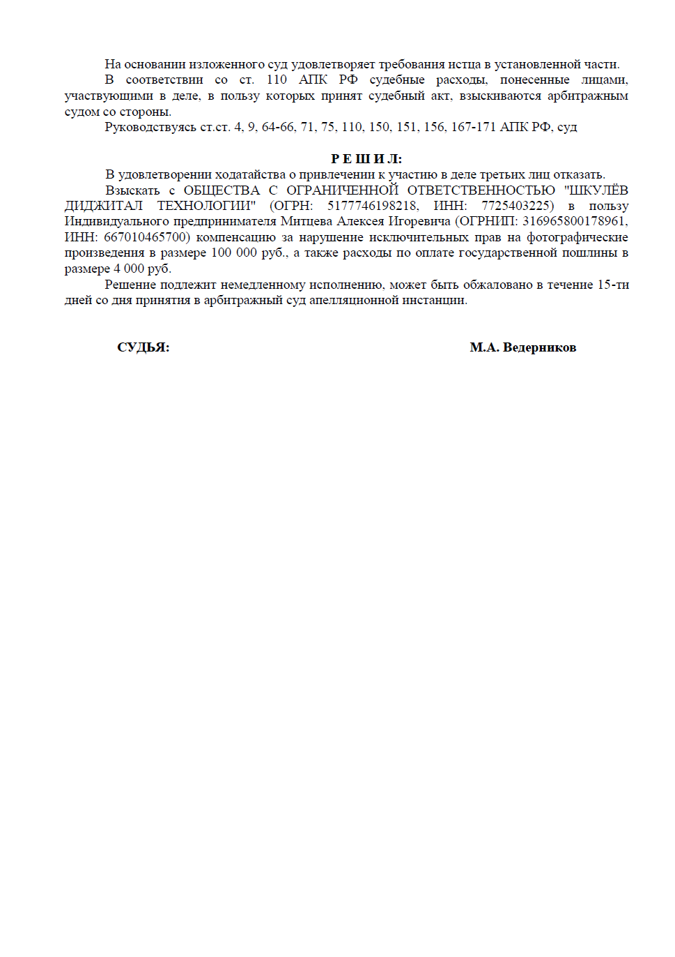 Арбитражный суд города Москвы полностью удовлетворил исковые требования. С ООО «Шкулёв Диджитал Технологии» взыскано: